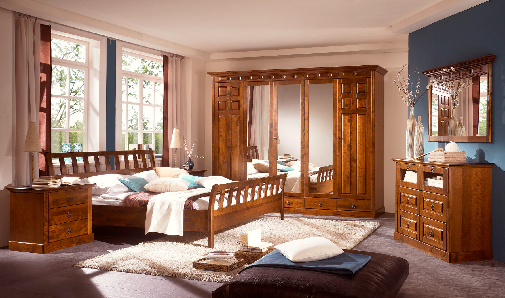 Elegant bedroom set with specially softened profiles and artificially oxidised handles. The façade surfaces of wardrobes, dressers and bedside tables are made of high-quality birch. The high-quality bed frame is also made of birch. Dark brown stain finishing brings out the peculiarity of the birch texture.